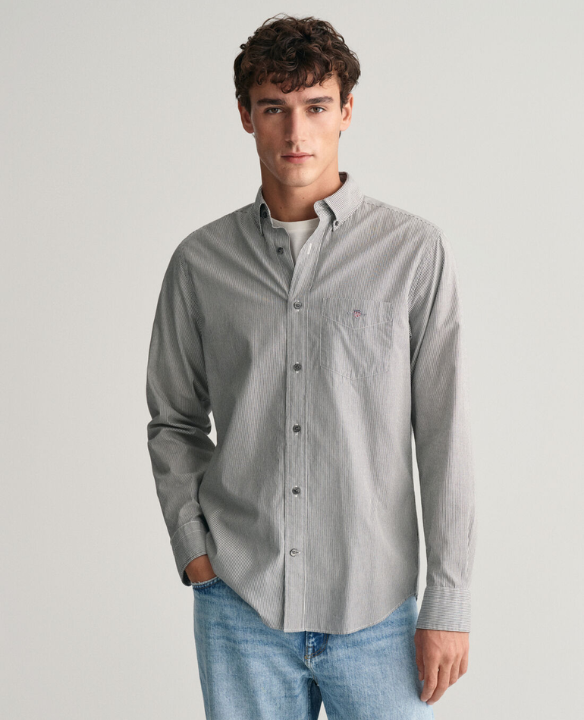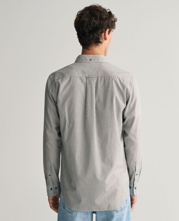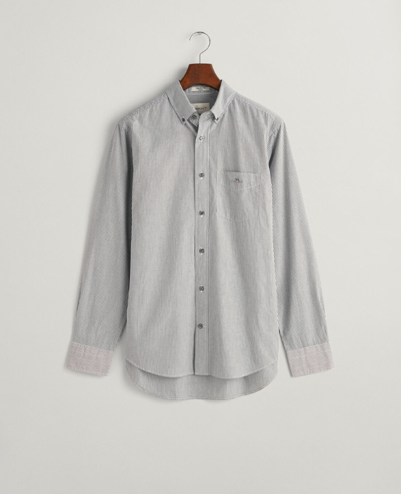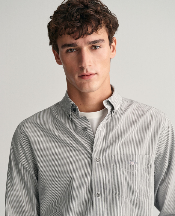 Crafted in a durable cotton poplin, this shirt is essential to any preppy wardrobe. Featuring a classic Banker Stripe pattern, this shirt is cut for a regular fit and features a button-down collar, curved hem and a box pleat with our signature locker loop at the back. It is accented with an '80s-inspired GANT shield graphic embroidered at the chest pocket.
