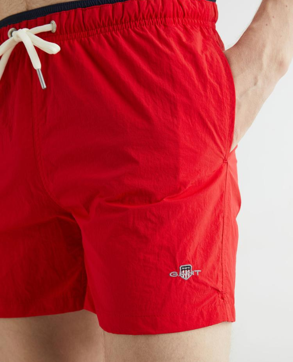 Men's swimwear with a loose leg cut in mid-thigh length. Classic seat height, contrasting edging of the flexible, variable drawcord waist. Two slanted side, one back pocket with velcro fastening, Gant logo embroidered above the lower edge of the left leg. Fancy mesh on the back, which prevents the swimsuit from filling with air when jumping into the water, mesh lining. The high-quality material composition is abrasion-resistant, colourfast, quick-drying and pleasantly soft to the touch