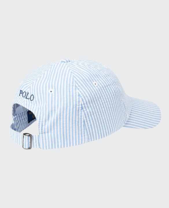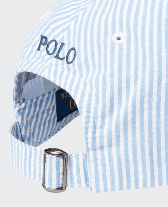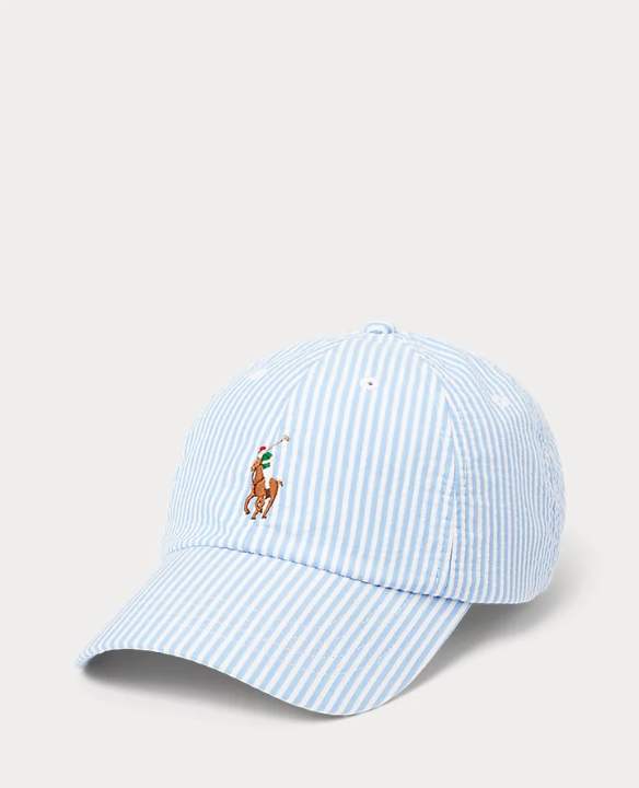 Our classic ball cap is updated for the season in lightweight striped cotton seersucker and embroidered with our multicoloured signature Pony